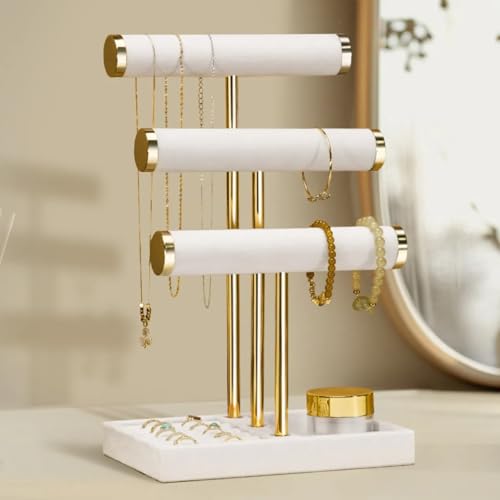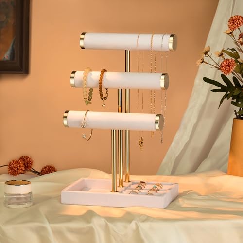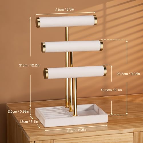 - 【5 Layers to Display Your Jewelry】: The bracelet holder display has 3 rods to hold a dozen bracelets, necklaces, hair ties and scrunchies. The 1 ring tray can store a dozen rings, and another tray is perfect for store lipstick and perfume.
