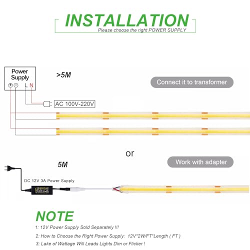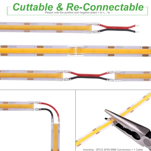 - [ SPECIFICATION ]: Length: 20FT/6M, Width: 8MM, Input Voltage : DC 12V, Current: 3A, Power consumption: 8W/M, Lumen: 700LM/M, CRI: >90, LED Density: 320LEDs/M, Cut Segment: 5CM; Package: 12V COB LED Strip 20FT, 2 Pieces 2 PIN 8MM Connector, 15CM Cable.