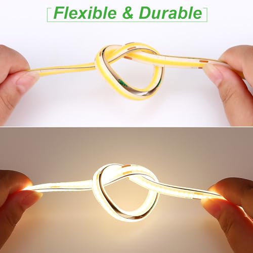 - [ Seamless COB LED Strip ]: Emits a smooth, even and beautiful continuous lighting effect, you are almost unable to see the dark dots like SMD, and its beam angle is 180 degrees, provides a wider range illumination.
