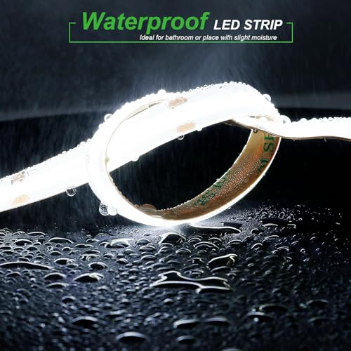 - [ IP65 Waterproof ]: The IP65 rating waterproof cob led strip is sealed with silicone glue to protect the light strips from splashing water and dust. Ideal for installation in bathrooms ,kitchen or places with slight moisture. Also the illumination space is wider than non-waterproof led strip.