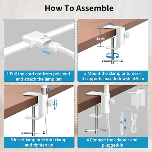 - ⚡【Space-Saving Separated Clamp & Highly Flexible Gooseneck】With separated c clamp, the tall desk lamp can be mounted to any direction. The metal clamp takes up a little space and supports max desk width of 4.5cm. Durable silicone gooseneck supports adjustable working height 39cm-62.5cm to satisfy your different needs in heights or angles.