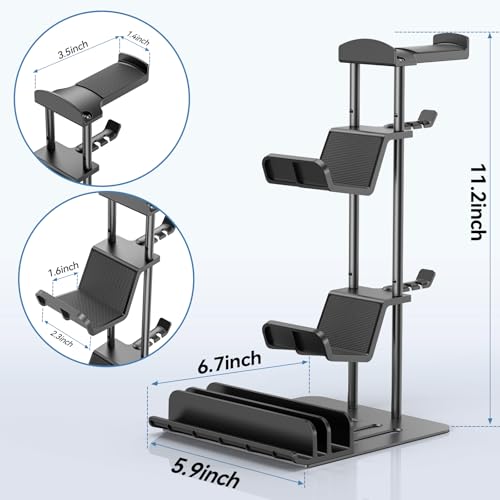 - 【Universal Compatibility】This game controller holder is suitable for vertical placement of various game pads, which saves space very well, and up to 2 game pads and 1 headphone can be placed. You can put the game controller on the stand, and you can also hang headphones and other items. At the same time, the groove of the storage organizer can hold smart phone, iPad, Switch.