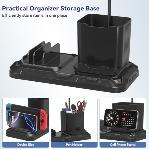 - 5 in 1 Desk Lamp Organizer – Combining desktop lamp, pen holder, cell phone holder, charging ports and device slot in one, it meets the multiple needs of lighting, storage, electronic use and charging, say goodbye to desktop clutter, keeping your desk surface neat and efficient, truly multi-purpose