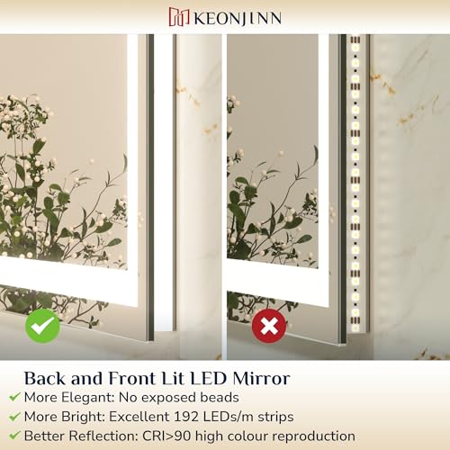 - 【Back and Front Led Bathroom Mirror】The led bathroom mirror with high density LEDs light strip shows brighter and softer backlit & front lit lighting. Two independent touch buttons for instant defogging and lighting control bring a seamless user experience.