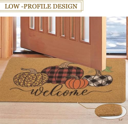 - 【Hello Pumpkin Doormat Size】The Hello Plaid Pumpkin Doormat measures 43*75cm (17×30 inches) with a pile thickness of 0.5 inches. Its non-slip PVC backing ensures a secure grip to prevent slipping and protect your floors.