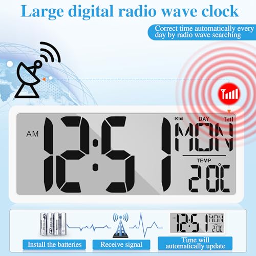- 15" ATOMIC DIGITAL WALL CLOCK LARGE DISPLAY: Our large digital wall clock adopts LCD high definition display and 4.6-inch ultra-big digits, it is easy to read from far distance at any angle. This digital alarm clock can show the time, date, month, day and temperature, bring you clear and comfortable visual sense. digital clock is great for living room, kitchen, bedroom, classroom, gym, nursing home and office
