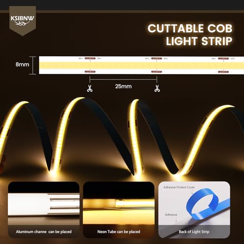 - 【Easy to Install】The back of the COB light strip is also made of strong adhesive, which is strongly sticky and has strong adhesion, and can be easily adhered to the wall or other smooth and clean places. And it can be cut every 2.5CM with scissors or can work as usual.