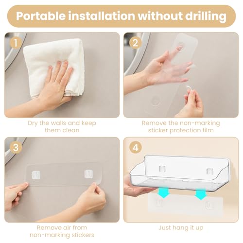 - 【Transparent PET Material】: The self adhesive shower caddy is made of high-quality PET material, which is durable, rust-proof, not easy to deform or damage, and has a long service life. The edge is designed with heightened height, so items are not easy to fall. Color: clear