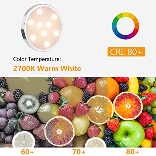 - Bright Light – Compared with traditional fluorescent light, LED light is more energy saving. And LED wired puck lights could provide brilliant illumination for your home about 50,000 hours. 2700 kelvin warm white light is bright and clean, allowing you to see the food in real color.