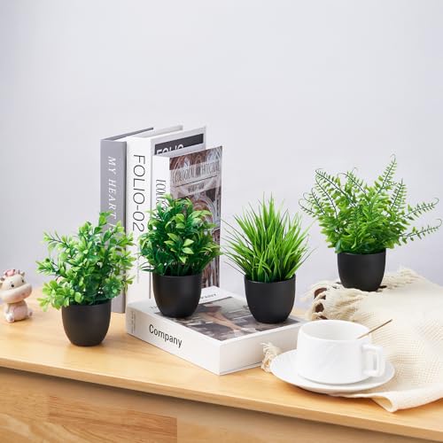 - 【4 Pcs Mini Potted Plants】You will receive 4 pack different styles of small artificial plants in black pot — enough to decorate multiple spaces without repetition. Each potted plant is about 19cm/7.5 inches tall and 13cm/5.1 inches wide; the compact size fits narrow corners (like bathroom counters or desk edges) and won’t take up valuable space, perfect for small apartments or offices.
