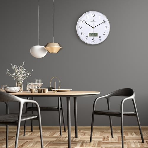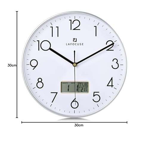 - LCD Calendar & Thermometer: Adopting large HD LCD screen that shows the month, date, the day of the week and temperature clearly. With black arabic numerals and black hands to stand out over a white dial, it is easy to read time everywhere in your home.(The LCD Calendar needs one AAA battery.)