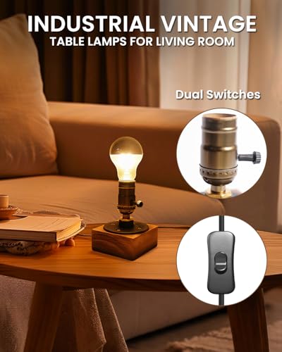 - Vintage Industrial Look:Solid pine wood base (90×90 mm) pairs with matte gold metal, instantly brings rustic steampunk charm to any desk, shelf or bedside table.Perfect small lamp for compact spaces.