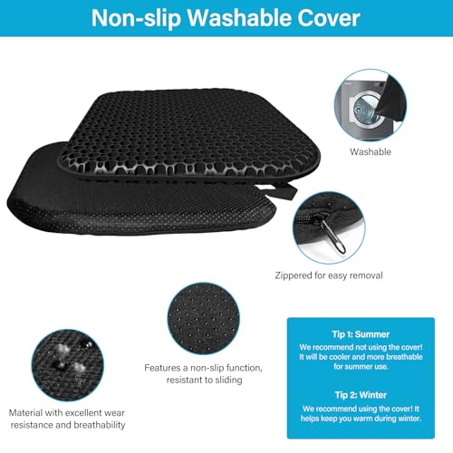 - High Quality Gel Cushion – Gel Cushion & Black With 2 Non-slip Cover: The gel seat cushion for office chair is made of high-quality gel material, which has better heat dissipation, gives you a cool experience in hot summer. The black non-slip cover can ensure that gel seat cushion for hip pain does not slip, and it can be machine washed. 2 gel seat cushion replacement covers so you can replace them whenever you want. The zipper design and detachable seat cover can better clean the gel seat cushion.