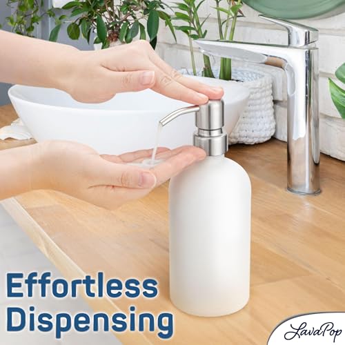 - DURABLE & RUST-PROOF – These soap dispensers are crafted from premium, thick glass containers and stainless steel pump heads; These materials not only provide a luxurious and sturdy feel but are also rust-proof for long-lasting use