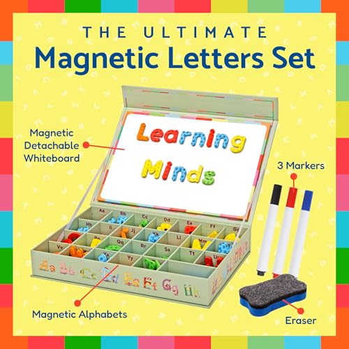 - THE ULIMATE MAGNETIC LETTERS SET – This beautifully built out set features an Alphabet picture box, A-Z star printed magnetic letters, Detachable magnetic whiteboard, 3 x whiteboard markers and whiteboard eraser.