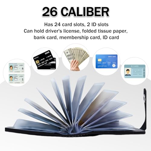- 【Suitable Dimension】the size of card holder is 4.53 * 3.35 * 0.98 inch (11.5 * 8.5 * 2.5 cm), including 12 double-sided card sleeves that holds up 24 card, and including 2 id card slots, holds up to 26 cards.