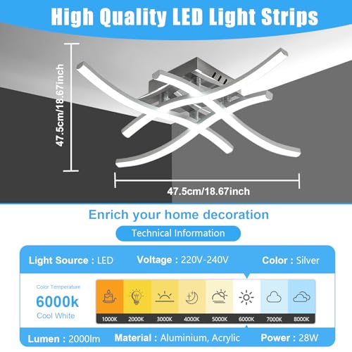 - ✨【High Quality Material】:Aluminum base and plastic lampshades.The LED ceiling light, in aluminum-colored metal with a matte effect, has 4 wave-shaped arms. Integrated LEDs and bars, with white plastic cover. IP20 protection makes the chandelier suitable for living room, dining room, bedroom, childrens bedroom.13.36*4.72*2.55inches