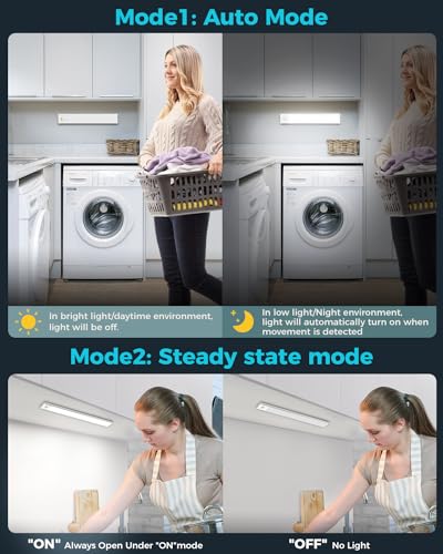 - 【High Brightness and 3 Modes】This under counter lights features high-efficiency LED beads, providing brighter and more uniform light. It comes with 3 lighting modes: On, Off and Auto motion sensor. In Auto mode, these wireless wardrobe lights automatically detect human movement in the dark within a 10 ft/120° range and turn off after 20 seconds of no movement