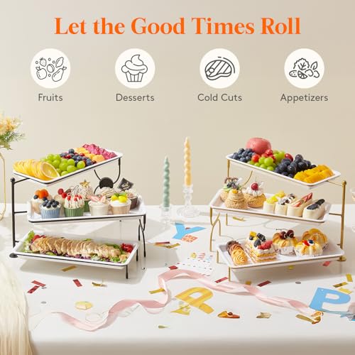 - Premium Durability: The 3 tier serving tray is crafted from sturdy food-grade PET plastic, free of BPA, ensuring it is shatter-resistant and crack-proof. The three-layer design enhances the presentation of desserts, appetizers, fruits, cold cuts, and more