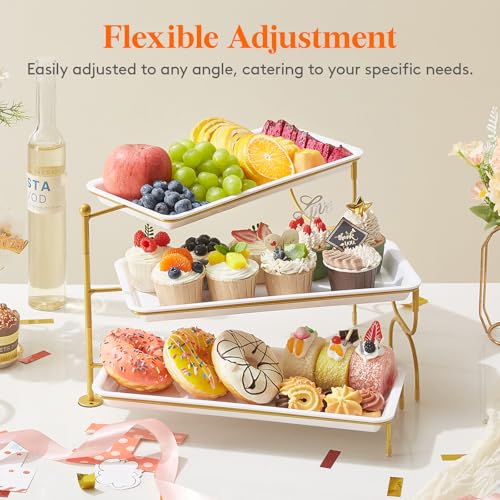 - Stable Support: The robust and flexible tiered tray stand can be easily adjusted to any angle, with rubber feet providing anti-slip grip, ensuring your guests can conveniently access various delicacies from all directions