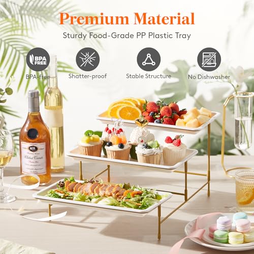 Lifewit 3 Tier Serving Tray for Party Supplies, 30x17cm Plastic Platters for Food, White Reusable Trays with Metal Display Stand for Buffets, Cake, Snack, Veggie, Fruit, Cookies, Dessert, Dishes