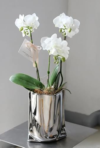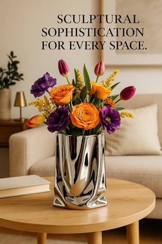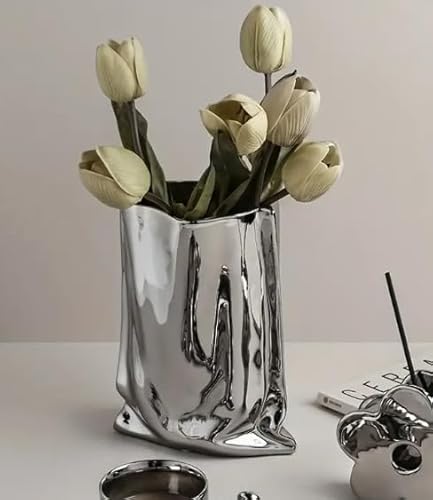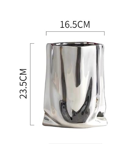 - A Modern Liquid Chrome ceramic vase with a unique crinkle-fold paper bag design. Measuring 24 cm high, 17 cm wide, this vase is perfect for creative flower arrangements or standalone décor.