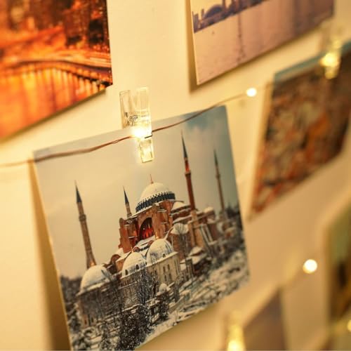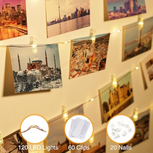 【120 LEDs & 60 Clips & 20 Nails】Our photo light has 120 LEDs and a total length of 12M. Comes with 60 clear clips to display multiple pictures, Christmas cards, prints, children’s artwork, paintings, sayings and more. Comes with 20 non-marking nails for hanging and fastening lights to walls, doors, or wrapping them around Christmas trees, picture frames, plants, garlands, corner bars, jars, and more