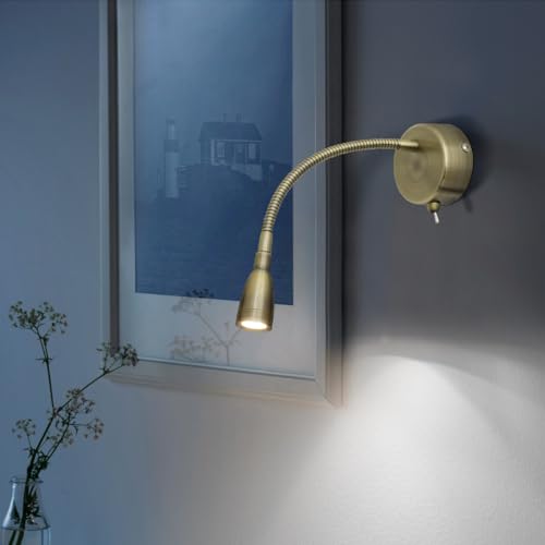 - Antique Brass finished wall light with a round back plate and adjustable flexible arm