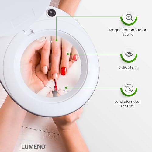 - Lumeno 721XGR with 127 mm glass lens, white with grey rubber protective edge, available in 3, 5 or 8 dioptres. 3 to 5 dioptres are suitable e.g. for cosmetics, crafts and hobbies, as a reading aid; 8 dioptres for checking small details such as solder joints etc.