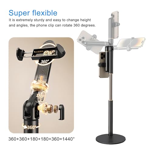 - 【Easy to handle】This mobile holder is extremely sturdy and easy to change height and angles, the phone clip can rotate 360 degrees,super flexible.You can easily turn the phone clamp to film vertical or landscape,plenty or hinges and swivel joints to adjust the position of the cell phone.Makes recording so much easier!!