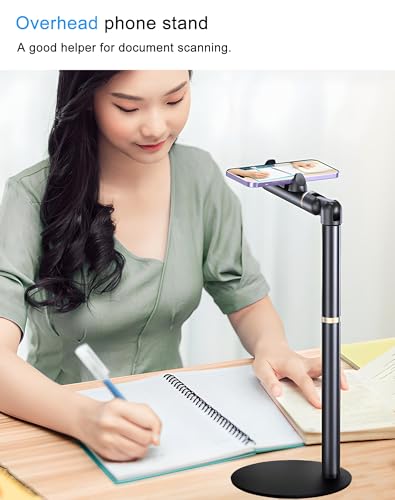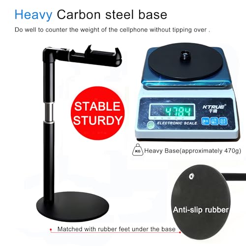- 【Stable & Sturdy】This overhead phone mount with heavy duty base(weighted: 0.47kg,Diameter:16cm). its heavy Carbon steel base matched with rubber feet under the base,do well to counter the weight of the cellphone without tipping over .
