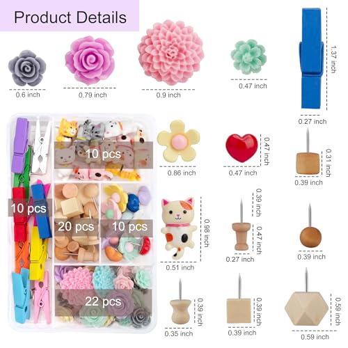 - What You Get: Package includes 104 pcs cute push pins,there are flowers,clips,Cat ,wood,smiley face flower,heart push pins in different colors,used to pin important papers and messages to cork boards, foam boards, maps or wall and more.