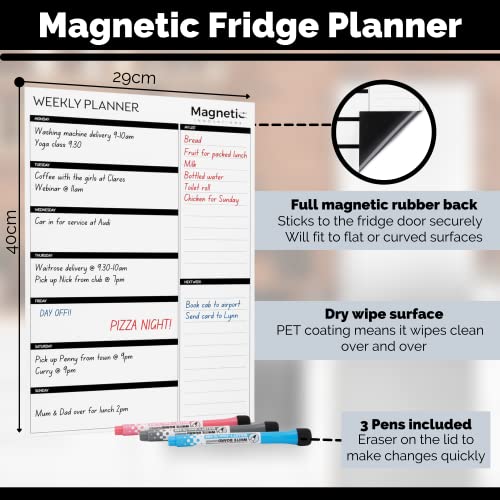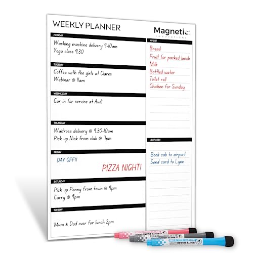 - A MULTI-PURPOSE FRIDGE PLANNER TO ORGANISE YOUR WEEK – Plan your meals, note down any appointments, use it as a homework planner or simply use it as a note pad for reminders. There’s also a separate space for a shopping list or non-date related notes