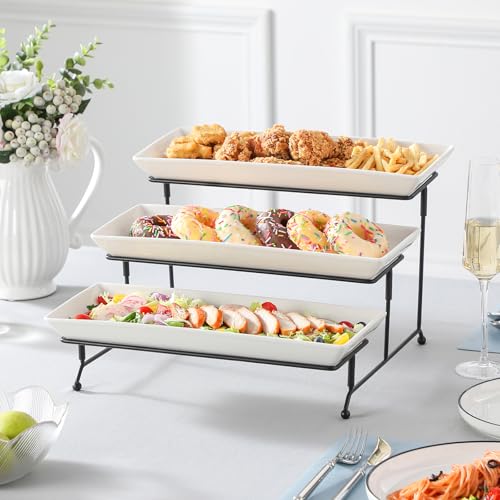 - 【3-Tier Design】The tier serving tray is made of porcelain, which is sturdy, chip and crack resistant, scratch resistant. No need to worry about scratches from your forks or knives. The cake stands are lead-free, cadmium free and non-toxic, you will never have to worry about any health problem. The 3-tier design enhances the presentation of desserts, appetizers, cheeses, fruits