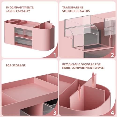 - 【Multifunctional Desk Organiser】:This desk organiser has three clear drawers and seven compartments,which provides enough space to store all desk accessories & storage products such as scissors,paper clips,sticky notes,pencils,pens,highlighters and all other desk supplies.It is a superb desk organiser drawers and accessory and can even be used as a makeup brush holder,kitchen organiser and more