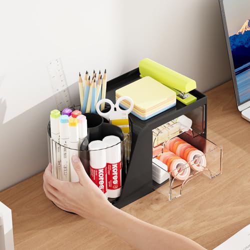 - 【Rotating Pen Holder + 2 Drawer】:Set of 6 compartments rotating pen holder, 1 top tray, and 2 drawers. This storage caddy allows you to turn up to 360° rotation to the left and right. Which keeps all of your small items within reach while you want. The 2 drawer organizer has enough storage to allow for office supplies organization. The best and convenient storage option for you