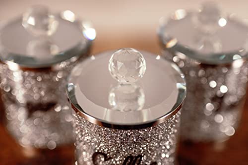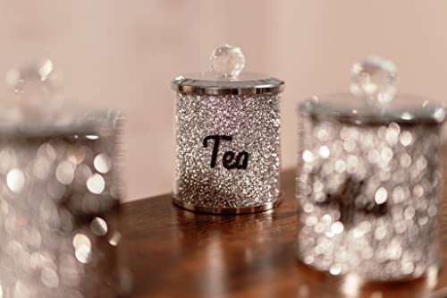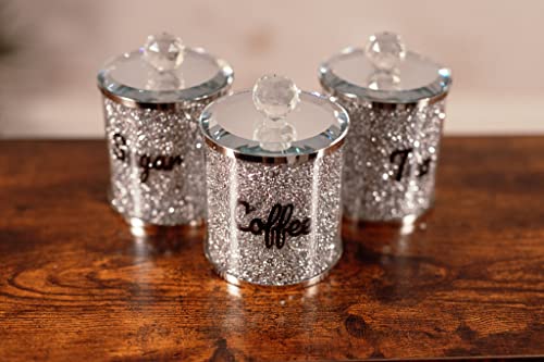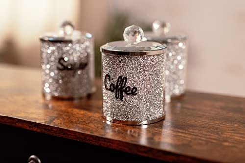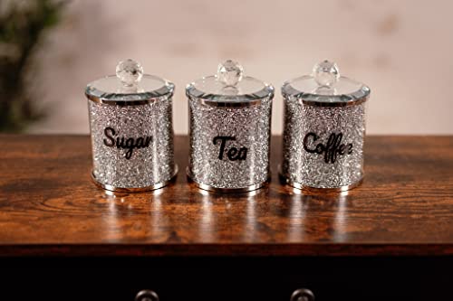 - Stylish Crushed Diamond Design: Add sparkle to your kitchen with this silver crushed diamond tea coffee sugar canister set. Our glamorous storage jars feature a mirror-crystal finish that blends with grey, cream, black, or any kitchen decor. These canisters sets for the kitchen are ideal in any modern homes seeking unique tea coffee sugar jars or standout cookie jars with lids.