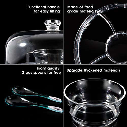 - 🍊Brilliant Design – The package come in four parts. Dome, tray, and a bowl can make you achieve your different needs by different combinations.And the extra spoons can help you in cooking salad,placing food or dealing with soup.The tray got a circle of bumps to avoid slip.