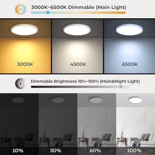 - 【Design-conscious night light】The LED ceiling light is designed with a backlight as a night light, which is a golden warm light with a color temperature of 2000K; The warm, soft and quiet light with an output of only 5W creates a perfect atmosphere at night and helps you relax and improve sleep quality; With the remote control, you can easily turn the night light on or off and switch the brightness between 10% -100% according to your needs to provide soft and comfortable light for your bedroom or other rooms. (Not compatible with wall dimmer)