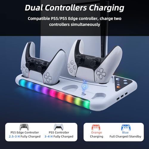 - Efficient Cooling and Fast Charging: Equipped with a high-precision microprocessor chip, the stand offers stable and efficient cooling for the PS5. It includes a charging dock for Dualsense and Dualsense Edge controllers, with fast charging times (3-4 hours for Dualsense, 2.5-3 hours for Dualsense Edge) and convenient LED indicators (orange for charging, blue for fully charged).