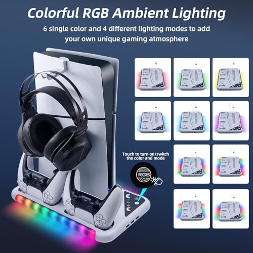 - RGB Cooling Charging Fan for PS5/PS5 Slim: This stand is custom-made for both PS5 and PS5 Slim models, ensuring a perfect fit for both the PS5 UHD and Digital versions. Its design provides a universal, one-stop solution, seamlessly integrating with your console and enhancing your gaming setup.