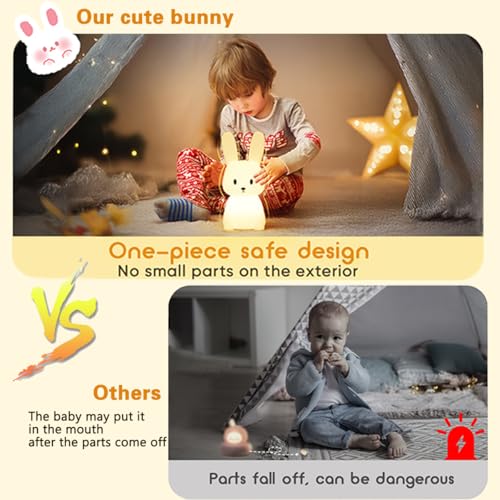 - Cute and safe bunny night light kids:Baby night light is made of washable silicone material,which is safe to use, easy to clean,strong in elasticity, comfortable and soft to touch.The bunny baby night light newborn has sleek ears and body with no sharp edges.Children can easily grasp and hug it without hurting delicate skin.The toddler night light is the best partner for children to fall asleep and playing.