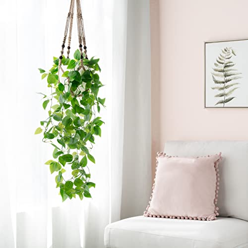 - Durable Material: Made of high-quality plastic, each leaf of our fake pothos plant has many stems and clear textures that make it looks realistic and vivid, also it will always maintain a bright fresh-looking green. Combined with plastic pot and cotton macrame hanger, it is ideal for indoor environments and will withstand the test of time
