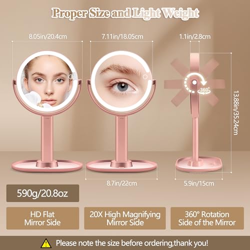 - 20x Magnifying Mirror with Light: The magnifying mirror 20x features 1x and 20x magnification with the 360° rotating design, ideal for makeup application, contact lens wearing, eyebrow tweezing, shaving, hair styling, or mascara application. Easily switch between magnifications for general use or detailed tasks like eyebrows and eyeliner.Enjoy enhanced visibility and convenience with this travel magnifying mirror with lights.
