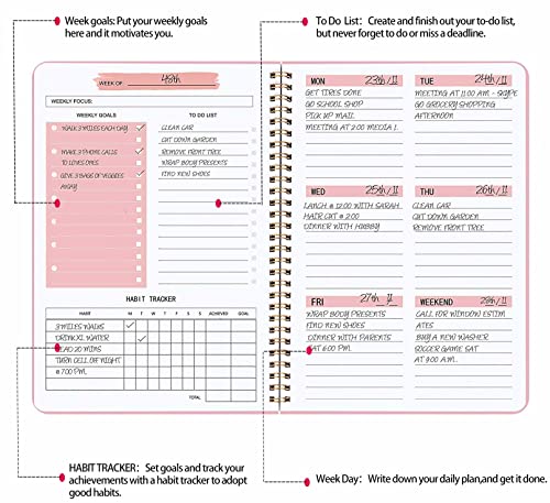 - 【52 Weekly Undated Planner】This weekly planner features space undated weekly planner, weekly focus, weekly goals, weekly to-do list, habit tracker and notes. Undated to help you organize your week and year(52 weeks).Write down and prioritize your Weekly goals & to do list and then assign tasks to each day for maximum efficiency.