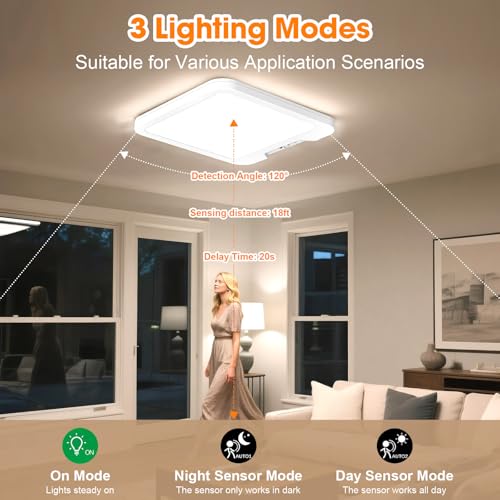 - Motion Sensor LED Ceiling Light: Instantly lights up when movement detected within 120°angle & up to 18ft range,auto-off after 20 seconds for energy efficiency,suitable for dark basement lighting.