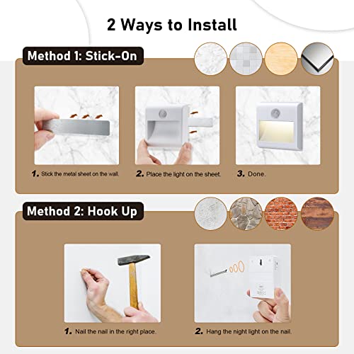 - [2 Ways to Install]: With included metal sheet and double-sided tape in the package, you can attache this built-in magnet stick-on night lights to anywhere you want. Or you can also just hang on the wall with nail