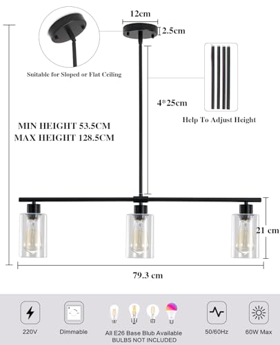 - 💡【Glass Pendant Light】Crafted from sturdy metal, this black pendant light boasts a sleek linear profile features 3 E27 sockets enveloped by glass lampshades, which showcases anti-oxidation and fade-resistant qualities, cleverly embodying an industrial style.