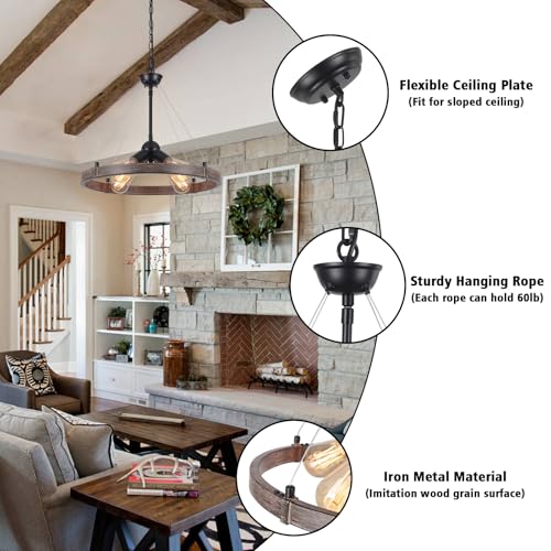 - 💡【High Quality Metal Material 】This rustic chandeliers ceiling light presents a wagon wheel-shaped frame encloses 4 sputnik-shaped lamp arms in matte black and imitation-wood-grain finish, which cleverly reflect a sense of industrial farmhouse style.
