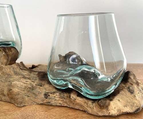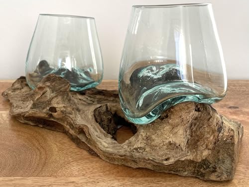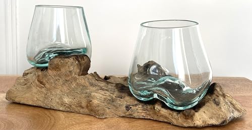 - My Square Mile Double Molten Glass Bowls On Wood Root Stand Glass Rustic Decorative Ornament Sculpture Key Sweet Display Dish